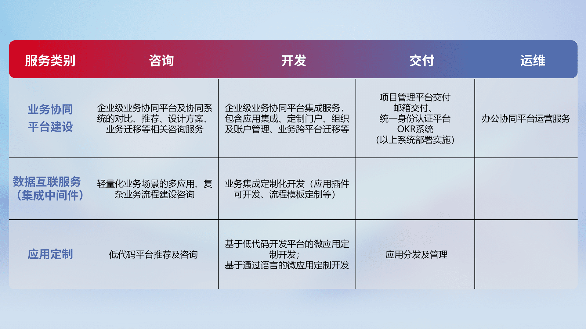 针对钉钉、、、企微、、、IDaas等平台级产品提供产品的规划、、、、方案、、、交付、、定制化开发等服务,,,,实现如统一协同办公、、、、智能客户服务、、混合会议管理、、智能数据查询、、等业务场景,,实现数字化转型。。。