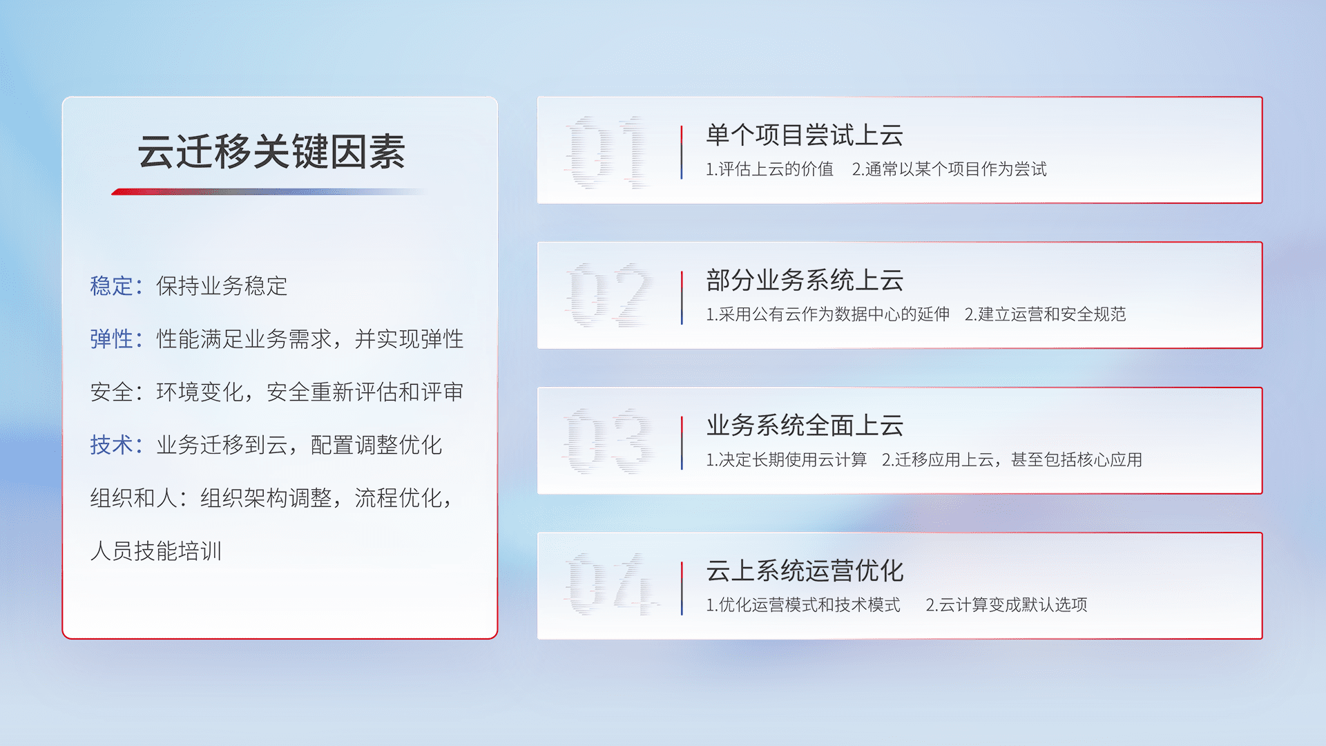 结合实际业务,,,从规划设计、、、云平台选型、、、云原生改造、、、数据迁移、、集成交付,,,迁移全过程为客户识别最佳上云路径,,,,做好风险识别管理,,设计网络架构、、、身份权限、、安全审计合规、、、操作审计、、日志审计、、监控告警策略、、、、多站点容灾设计等,,,对云上基础设施进行整体规划,,,,提升IT治理水平,,以满足弹性、、高可用、、、高性能的需求。。。