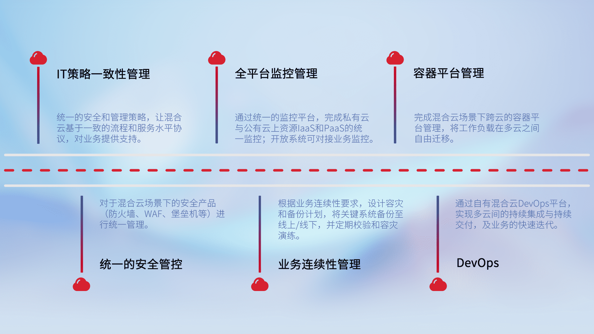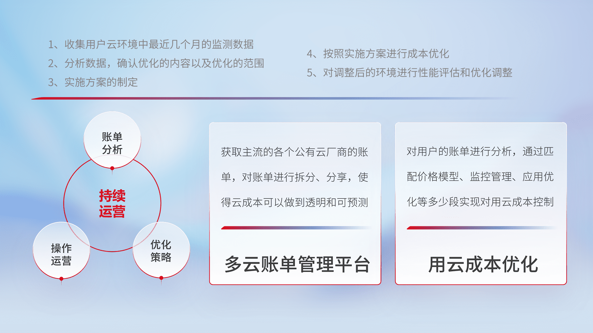 通过多云纳管,,以统一的资源数据模型把客户的云资源进行抽象和封装,,,进而实现对多云资源的统一操作,,保障云资源管理的可靠性、、、、稳定性与可用性。。。。量身定制化运维内容,,配置、、、、开发运维、、、、补丁管理、、备份、、监控、、、认证和访问管理、、、审计和日常巡检等,,保障在用云过程中的可靠度,,,稳定度以及高可用率。。
